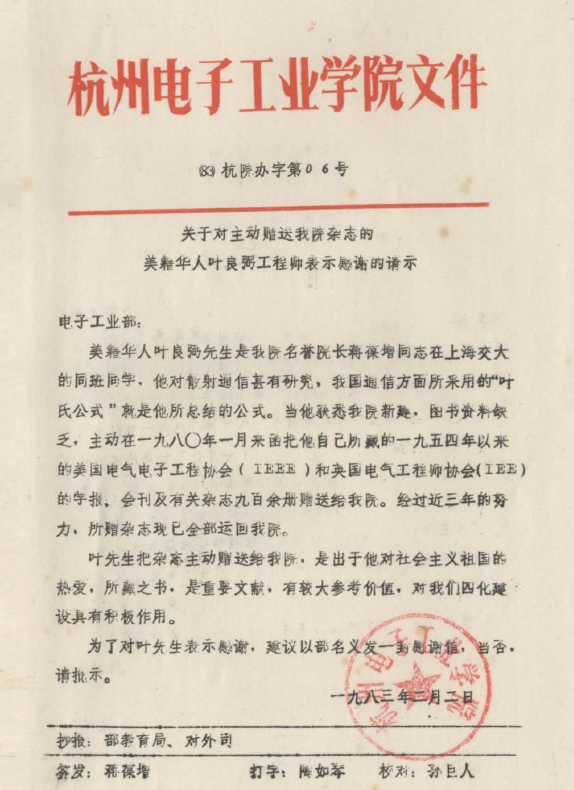 1983 年 4 月 12 日,在蒋葆增院长前期多方努力下,美籍华人叶良弼先生捐赠的期刊全部运抵我院。上世纪 70 年代末至 80 年代初,国内科技教育界外文学术资料十分匮乏。学院正值初建时期,外文文献短缺问题尤为突出,给教学和科研带来很大困难。叶良弼先生是蒋葆增同志在上海交大的同班同学,他心系祖国教育科技事业,在得知学院新建、图书资料匮乏的困境后,于1980年1月主动来函,决定将其收藏的 1954 年以来的美国电气电子工程师协会(IEEE)、英国电气工程师协会(IEE)的学报、会刊及相关期刊共 900 余册捐赠我院。这批文献品类齐全、年代连贯,不仅极大丰富了我院外文期刊的馆藏总量,更填补了我院在电气电子工程领域外文文献入藏的空白,将我院此类期刊的入藏历史向前延伸,为初期教学科研工作提供了宝贵的学术资源。